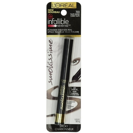 Create a smoky-eyed look in one step when you use L Oreal Paris Infallible Smokissime Never Fail Eyeliner. It comes with a revolutionary foam tip applicator that blends the color with just one swipe. This L Oreal Paris eyeliner is made of a gel-like powder that gives you a strong smoky eye with no smudging needed. Simply apply it above or below the lash area to create classic and bold looks. You can also use the powder eyeliner pen to apply it to the outer corner of the eyes for an edgy look. The special formula lasts for up to 14 hours. It s available in several colors so you can pick the one that best suits your complexion and personal sense of style. Match the look to whatever you re wearing that day.